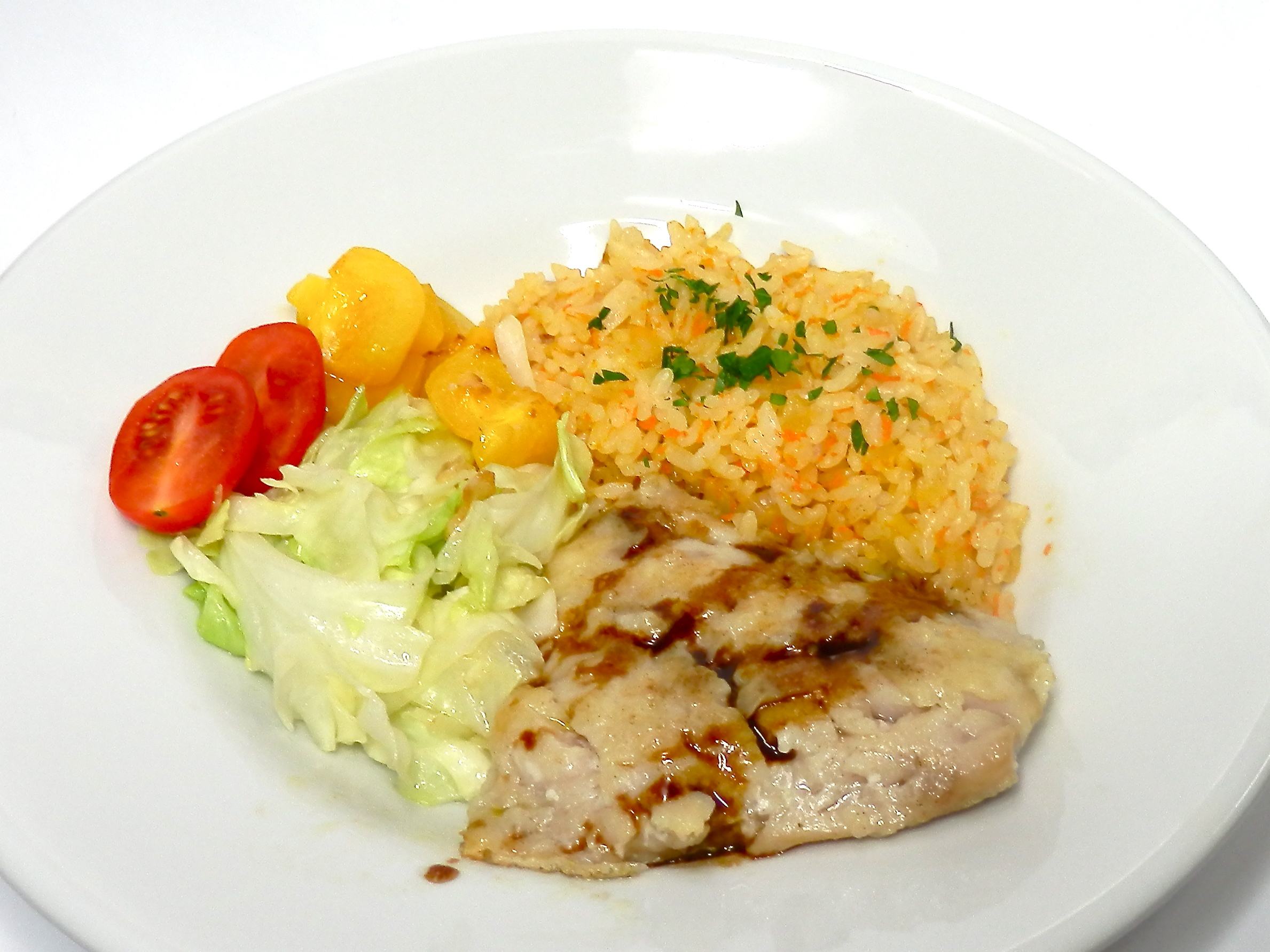 左から、骨とり済み天然めばる(ナガメバル)、パプリカ(黄)、ミニトマト、キャベツ、化学調味料不使用バルサミコソース。