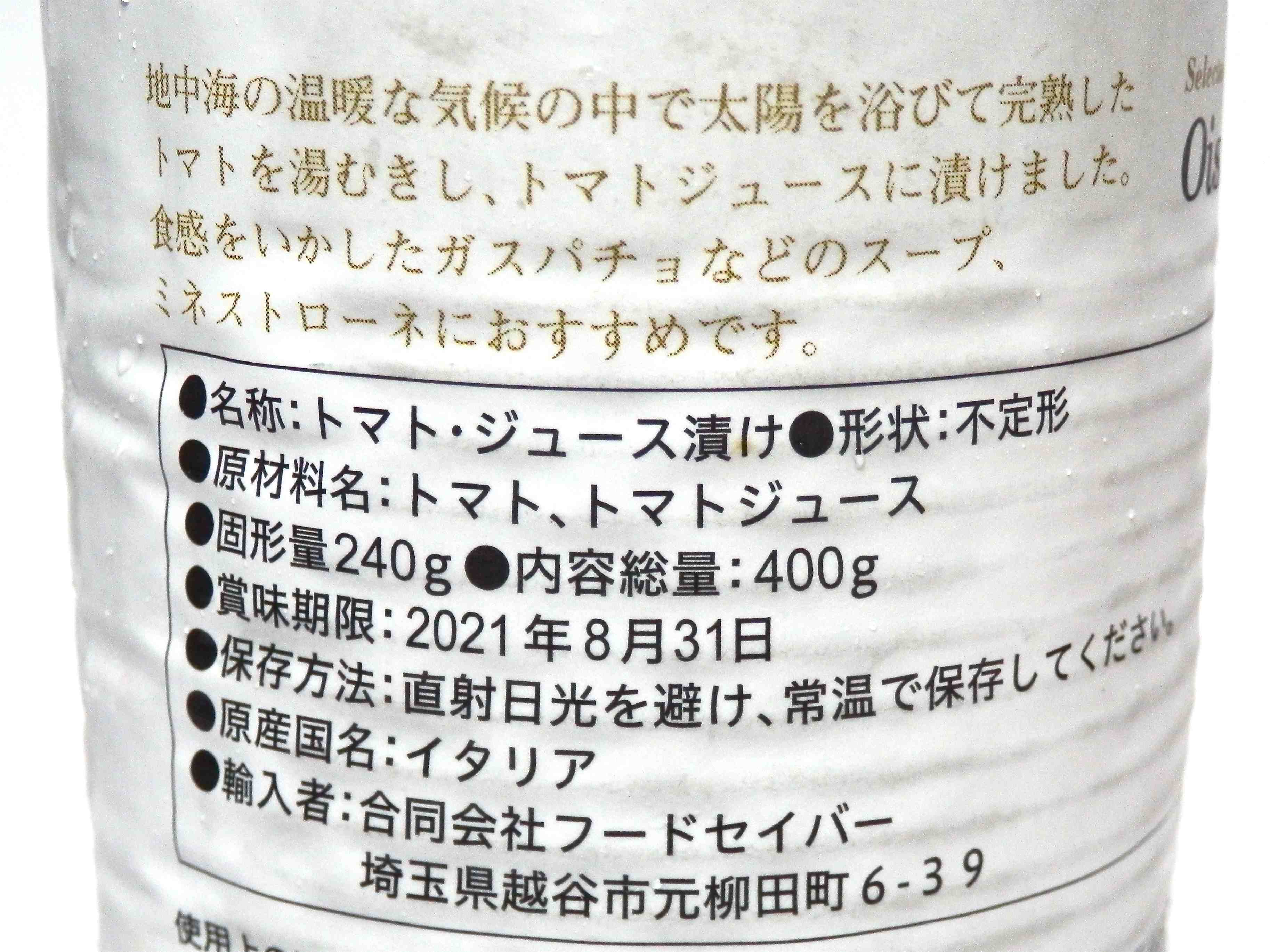 まず、このトマト缶、前から気になってたんですが、198円(税抜)と、普通にスーパーに売っている物の倍くらいの値段がします。